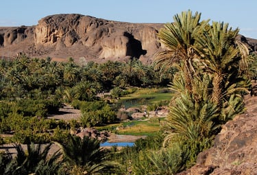 Visite de Foum Zguid, de son ancienne kasbah et de la palmeraie. L'après-midi, départ en 4x4 vers le Parc National d'Iriki, avec une pause dans une oasis et un site de fossiles préhistoriques. Arrivée à la maison d'hôtes entourée de vastes plaines, avec vue sur les dunes. Dîner et nuit dans un cadre paisible.