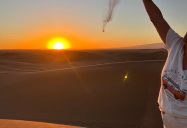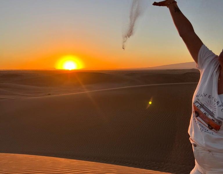 Après un copieux petit déjeuner, départ en 4x4 pour l'Erg Chegaga. Le trajet traverse les plaines du lac asséché d'Iriki, avec des pauses pour visiter une oasis offrant une vue sur les montagnes du Colorado marocain, et un site de fossiles marins. Arrivée aux dunes de Chegaga et installation au bivouac. L'après-midi, détente et exploration des dunes, avec possibilité de grimper à la plus haute dune du Maroc (300 m) pour une vue panoramique. Le coucher du soleil est suivi d'une balade en dromadaire, puis un dîner autour du feu. Soirée musicale et nuit sous les tentes dans le silence du désert.