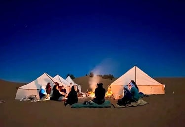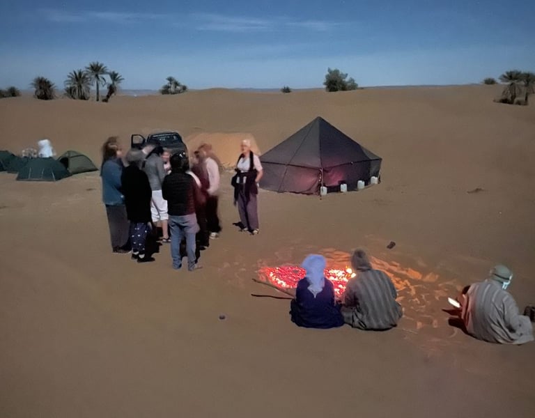 Départ à 14h de Foum Zguid en 4x4 pour traverser le parc national d'Iriki et l'ancien lac asséché, en direction des dunes de l'Erg El Mhazil. À l'arrivée, accueil par l'équipe et installation du bivouac au cœur du désert. Vous pourrez admirer le coucher de soleil depuis la grande dune, un moment magique. Le dîner sera servi autour du feu, suivi d'une soirée musicale sous les étoiles.